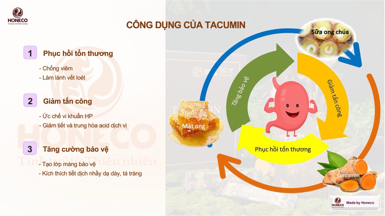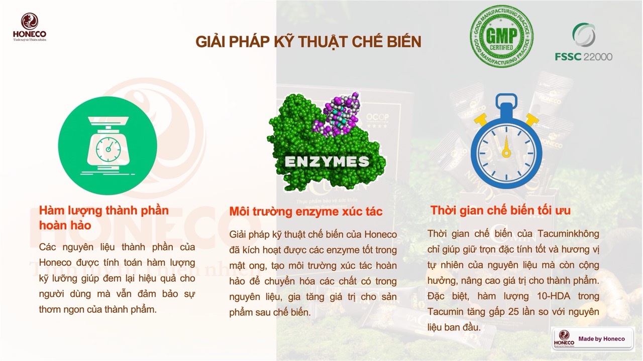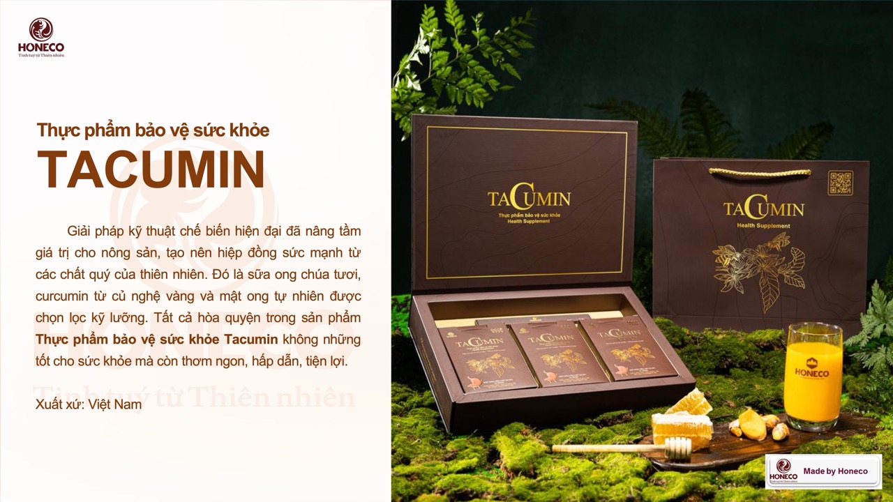 Giải pháp kỹ thuật chế biến hiện đại đã nâng tầm giá trị cho nông sản, tạo nên hiệp đồng sức mạnh từ các chất quý của thiên nhiên. Đó là sữa ong chúa tươi, curcumin từ củ nghệ vàng và mật ong tự nhiên được chọn lọc kỹ lưỡng. Tất cả hòa quyện trong sản phẩm Thực phẩm bảo vệ sức khỏe Tacumin không những tốt cho sức khỏe mà còn thơm ngon, hấp dẫn, tiện lợi.