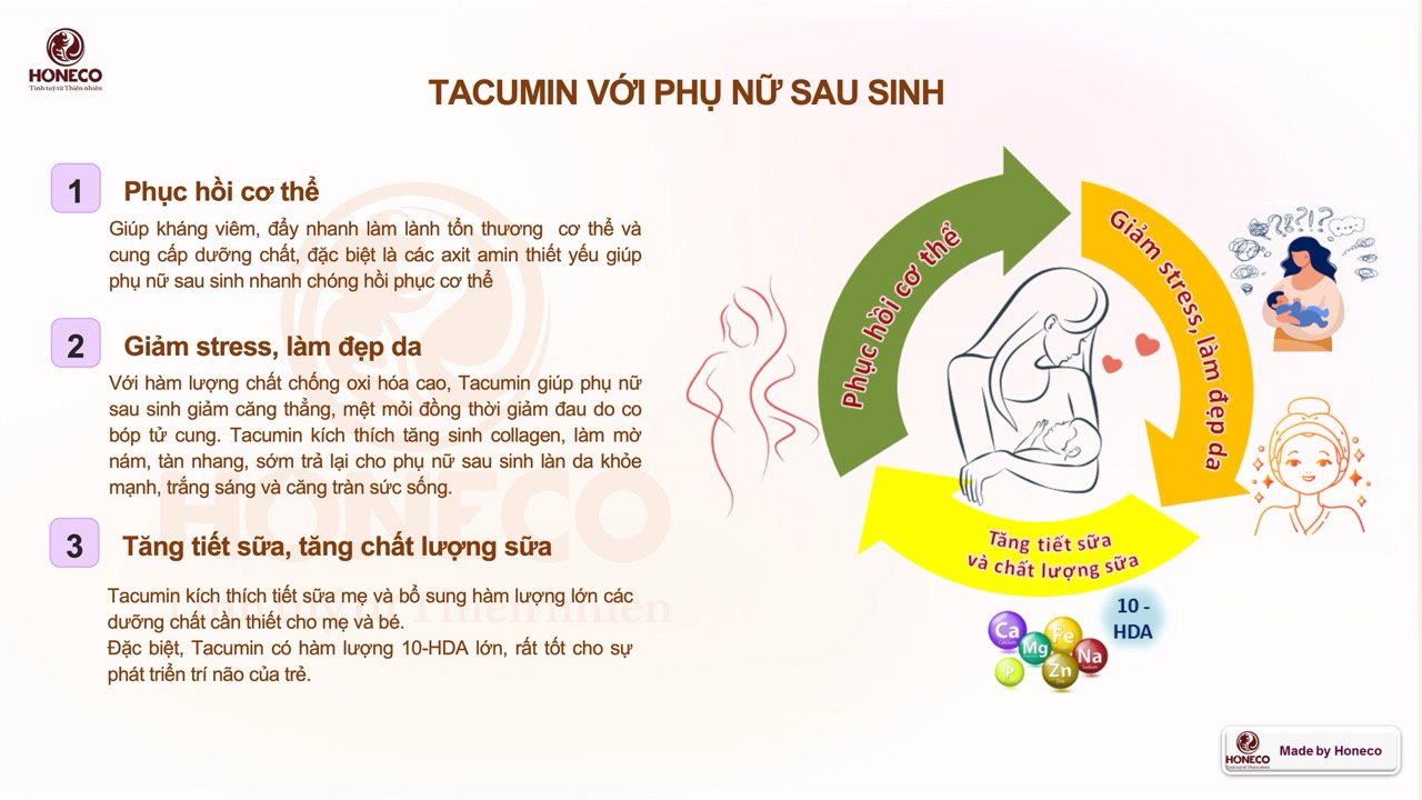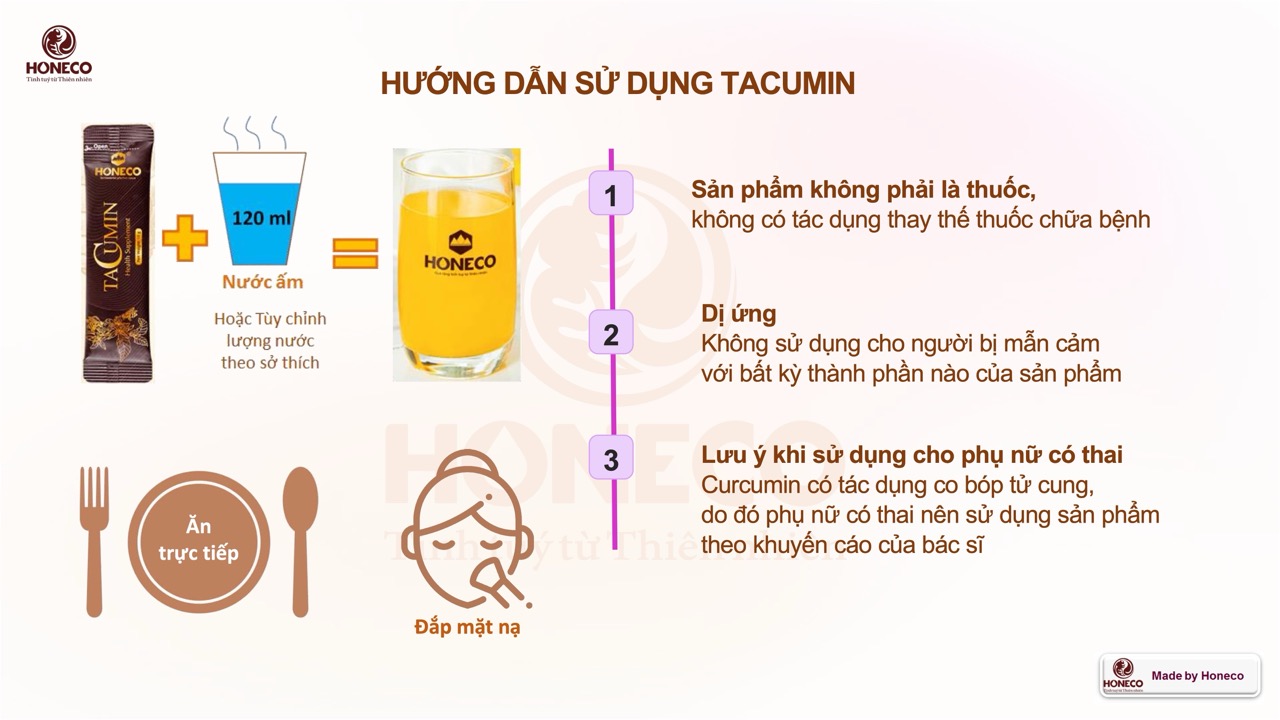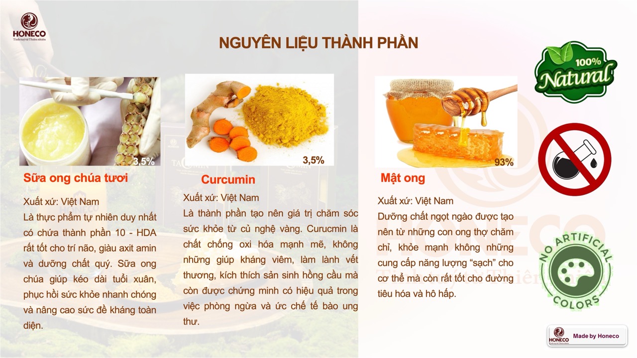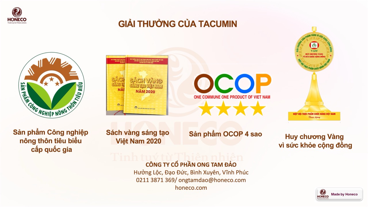 Giải pháp kỹ thuật chế biến hiện đại đã nâng tầm giá trị cho nông sản, tạo nên hiệp đồng sức mạnh từ các chất quý của thiên nhiên. Đó là sữa ong chúa tươi, curcumin từ củ nghệ vàng và mật ong tự nhiên được chọn lọc kỹ lưỡng. Tất cả hòa quyện trong sản phẩm Thực phẩm bảo vệ sức khỏe Tacumin không những tốt cho sức khỏe mà còn thơm ngon, hấp dẫn, tiện lợi.